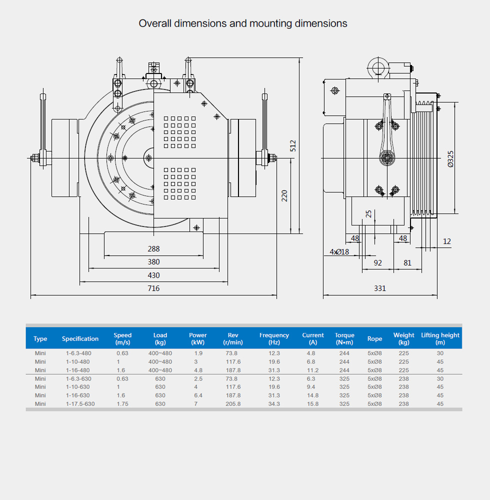 Light and small, the traction machine can be mounted on the top, at the bottom or in the wall, can be used in machine-room and